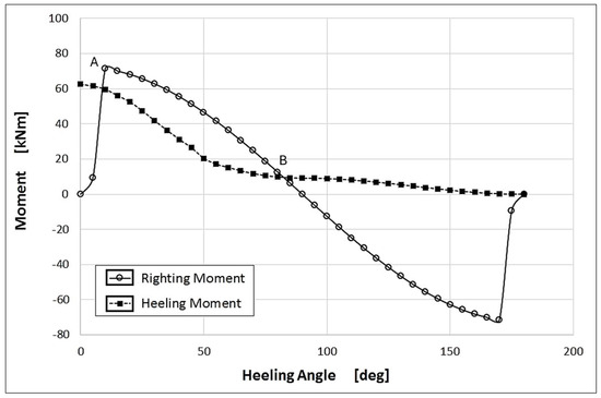 The two points A and B, where the righting and heeling moments are equal, represent two profoundly different situations of equilibrium: point A is a stable equilibrium point: even if the heeling angle increases, the righting moment will always remain greater than the heeling moment and, thus, the boat will tend to return to its original position. On the other hand, point B is an unstable equilibrium point: an increase in the heeling angle would correspond to a heeling moment that is gradually larger than the righting moment, ultimately leading to capsizing. Conversely, if α decreases, the boat quickly straightens up to return to the stable equilibrium at point A. To avoid capsizing, designers typically limit the maximum allowable value for heeling torque so as to induce the breakage of the rig before the boat overturns on the water.