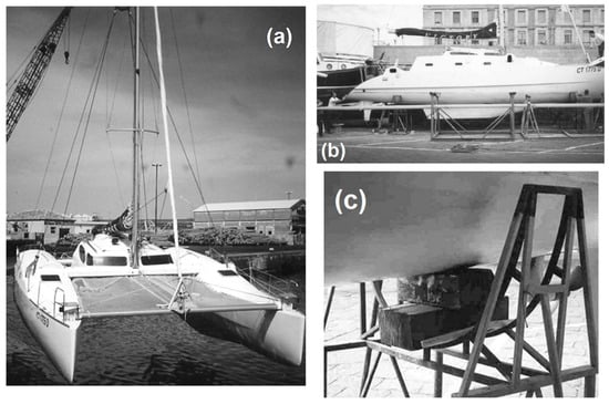 This paper aims to characterize the stiffness and under-load behavior of the catamaran through the experimental validation of an FEA model. The ultimate goal is to refine the initial design. To achieve this, the catamaran was placed in “dry” conditions (Figure 5a) and positioned on a metal support structure (Figure 5b) constraining each hull at two points, respectively 2.3 m from the bow and 2.2 m from the stern. This setup facilitates stress analysis, enabling an accurate assessment of the catamaran’s performance under load. To prevent undesirable damage during testing, wooden blocks were interposed between the metallic structure and the vessel’s keel (Figure 5c). The experimental setup is described in detail in the following section.