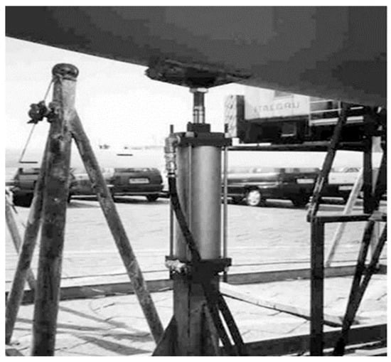 An upward vertical load was applied at the bow of the right hull. This load was applied using a double-acting pneumatic actuator (Waircom cylinder (Waircom, Milan, Italy), series CPU, bore = 100 mm, stroke = 250 mm) positioned at 0.75 m from the support of the right hull of the catamaran (Figure 6).