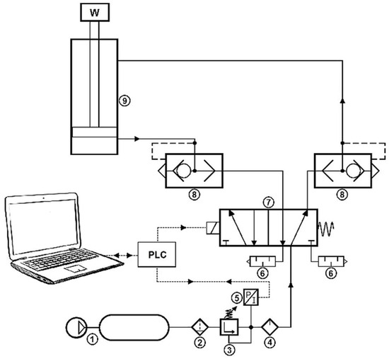 The compressed air supply is managed remotely via a PC-PLC system, managed by the Zelio Soft 2 V5.1 software. The PLC used is Zelio SR3B261BD produced by Schneider Electric. The pneumatic circuit moving the actuator is shown in Figure 7. It consists of a compressor (1), a filtering unit (2), an air lubrication unit (4), and a digital pressure regulator (3) feedbacked through a pressure transducer (IFM PA-9024, 0–10 bar) (5). The air coming from the FRL group, through a 5/2 solenoid valve (7) and a quick exhaust valve (8) for each of the 2 ways, produces the movement of the shaft of the double-acting cylinder. To prevent air leakage and annoying noises from the solenoid valve, a pneumatic silencer (6) was used for each way.