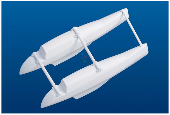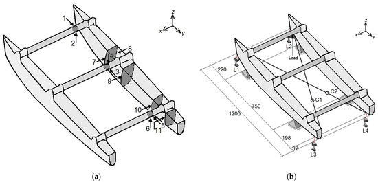 To measure the strains induced in the connecting beams, six strain gauge rosettes were used, each with three measuring grids oriented at an angle of 0°/45°/90° (Micro-Measurements: C2A-06-125WW-120). They were placed at a distance of 1/4 of the length of each beam from the right hull, along the y (2, 4, 6) and z (1, 3, 5) directions, respectively (Figure 9a,b).