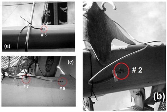 The deformations induced on the right hull, close to the junctions of the central and rear beams, were measured using five rosettes of the same type as the previous ones, arranged along the x direction (7–11). In particular, rosettes #7 and #8 were arranged at the same cross-section of the hull, on the internal and external walls, respectively. Rosette #9 was arranged symmetrically to #7, relative to the central beam axis (Figure 9c). Rosettes #10 and #11 were symmetrically arranged relative to the stern beam axis on the inner wall of the hull.