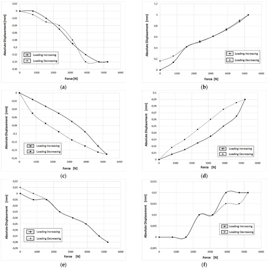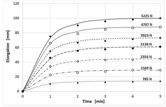 As shown in Figure 12, Kelvin–Voigt’s model describes a pseudo-exponential curve tending asymptotically to F0/k. Table 2 shows elongation values from the L2 sensor after 5 min from loading, those estimated for and k values at each load step.