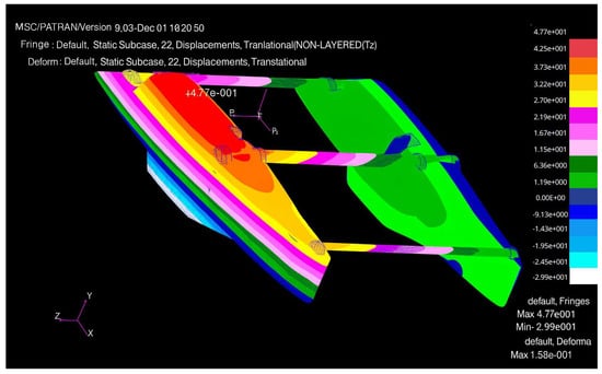 The heeling moment reaches its maximum when the windward hull emerges completely from the water. At this point, it assumes a value equal to twice the product of the boat’s weight (displaced by the submerged hull) and the distance between the boat’s centerline and that of a hull (moment arm). The maximum moment applied was considered as the maximum value of stability reaction of the boat. As is clear from the plot (Figure 4), the reaction moment value is displayed with maximum value at 10.10° heeling. It has been proved useful to analyse the loads due to the maximum heeling moment in order to compare the stress state (FEA) under such conditions. Accurate knowledge of the vessel’s stability is a fundamental step for the development of the reliability of the following FEA model.