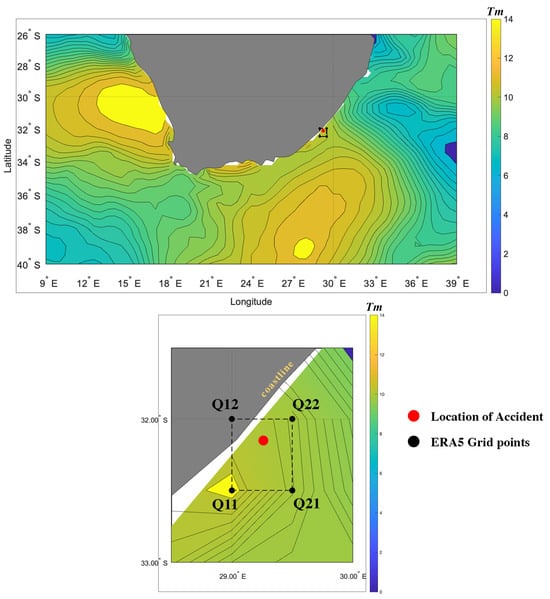 To more accurately reflect the conditions at the exact accident location, a triangular linear interpolation technique was applied to the surrounding ERA5 grid points to estimate values at the precise coordinates of the accident site (−32.15°, 29.26°). This method is geometrically equivalent to interpolation within a planar surface bounded by three known vertices and provides a stable, physically meaningful estimate of conditions at the target location. Full bilinear interpolation could not be applied due to the absence of oceanic data at one of the ERA5 data points (Q12). This is because the accident location is quite close to the coast and is bound by only 3 oceanic data points. This localized approach helps capture finer spatial gradients in wave parameters, especially given the 28.1 km distance between the closest ERA5 node and the ship’s GPS-recorded position. The grid points used for the interpolation are Q11 (−32.50°S, 29.00°E), Q22 (−32.00°S, 29.50°E), Q12 (−32.00°S, 29.00°E) and Q21 (−32.50°S, 29.50°E), represented in Table 1. Additionally, interpolated plots (see Figure 2) provide a space-resolved view of wave dynamics from a Lagrangian perspective, mimicking the ship’s experience more faithfully. This approach captures the evolving sea state as experienced directly by the vessel, rather than relying solely on the nearest grid data. The results derived from the interpolation are consistent with previous studies conducted in the same region, reinforcing the validity of the use of ERA5 for this case study [24,35].