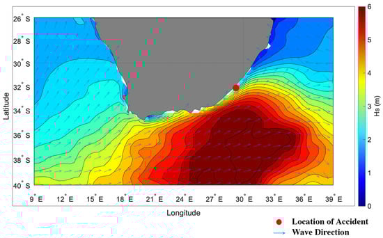 At the accident site, wave conditions immediately preceding and during the accident were dominated by long-period swell. Specifically, at the accident time, the Hs for combined waves was 3.24 m. Combined waves refer to a combination of windseas and swell waves. The Hs for swell and windsea were 3.04 m and 0.99 m, respectively. Mean wave periods (Tm) were 10.51 s for swell, 4.13 s for windsea, and 9.96 s for combined waves. The significantly higher swell wave height and period confirm swell dominance over locally generated windsea. Figure 3 shows the spatial distribution of Hs for combined waves, showing the wave direction (θ) in the accident region.