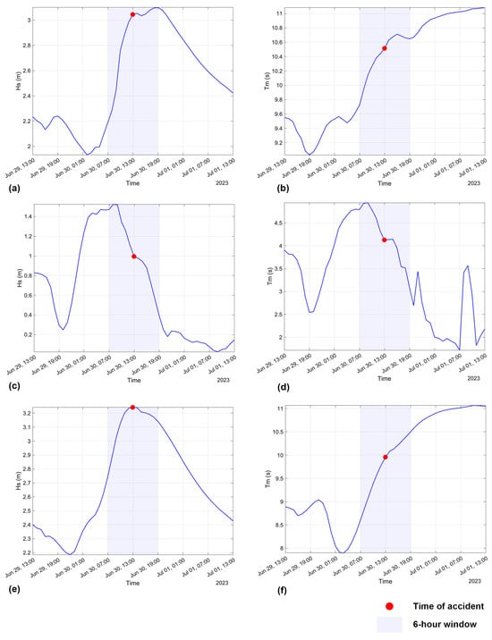 The temporal evolution right before and after the accident was investigated. There was an Hs peak of 3.24 m at the time of the accident, which is sufficient to necessitate a rough-sea warning according to the warning guidelines set up by the WMO [36]. The Hs at the time of the accident indicates relatively high wave energy compared to earlier conditions (Figure 4). While Hs is a critical indicator of sea state severity, the following analysis explores whether this alone was sufficient to cause the incident or whether additional contributing factors, such as wave steepness, cross-sea development, and wave–current interactions, played a more decisive role.