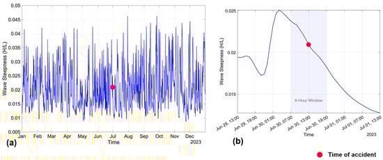 Wave steepness at the location and time of the accident: (a) Jan to Dec 2023; (b) 24 h before and after the accident.