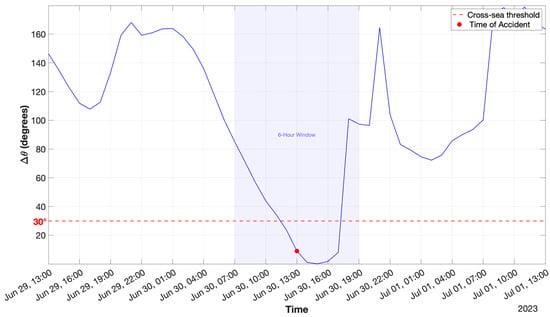Crossing sea states has been shown to create hazardous sea conditions and cause large waves [41]. In a global study examining ship accidents related to rough seas, Zhang and Li [42] identified that 45% of the 755 recorded incidents occurred in crossing seas where the angle ( exceeded 30°. Based on this, we use 30° as the threshold for assessing the crossing seas. Figure 6 shows a rose diagram of the swell and windsea directions in the study region at the accident time. The swell waves show a strong directionality, with most of the swell waves approaching from the south-west, from the Southern Ocean. This corroborates what was discovered in the previous literature [43]. Wave direction (swell-dominant) was ≈204°at the accident time, opposed by the Agulhas Current. Global forecasting models like ECMWF’s Integrated Forecasting System (IFS) often exclude or insufficiently resolve surface current effects, leading to potential underestimation of wave severity in current-dominated regions [44]. At the time of the accident, the cross-seas (Δθ) were below the threshold (8.98°). A temporal analysis of Δθ is shown in Figure 7, giving us a more detailed view of the cross-sea condition before, during, and after the accident. Hours before the accident, cross-sea conditions dominated the region, gradually collapsing into a near-aligned wave system (Δθ = 8.98°). We retain Δθ (swell–windsea angular difference) only as a diagnostic of the brief directional collapse immediately before the accident (Δθ dropped from ≈170° to ≈9° between 10:00 and 13:00 UTC). This sudden alignment visually disguised the persistent spectral bimodality but, because windsea energy was negligible, did not itself modify the load on the vessel. Calmer sea conditions have been known to be those with the largest danger of an accident [45]. This is confirmed by another sharp increase in the cross-seas hours after the accident.