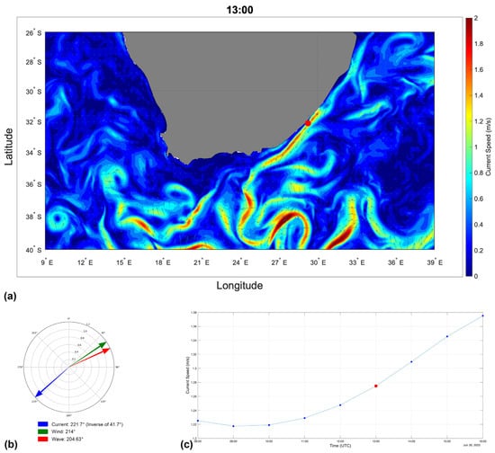 Wave–current interactions are known to significantly influence wave steepness and overall sea hazard levels, especially in dynamically active regions like the Agulhas Current zone [46]. The spatial distribution of CMEMS hourly surface current data at the accident time and location is shown in Figure 8a. At the exact time and location of the accident, the current speed was 1.27 m/s (Figure 8c), and the current direction was southwestward (41.7°). The current was opposing the wind and wave direction (214° and 204°, respectively), as shown in Figure 8b. While the Agulhas Current was relatively consistent during the day of the accident, our earlier analysis shows that the wave field evolved significantly. In particular, the arrival and intensification of a long-period swell from the SW leading up to the accident, combined with the opposing current, created conditions for maximum steepness amplification and directional compression at the accident time. This convergence of energetic wave input and persistent current flow constitutes a high-risk window for extreme wave behavior, even if the current itself did not change substantially, as wave–current opposition amplifies spectral energy transfer [10], particularly in Agulhas retroflection zones. Peak current coincided with maximal swell energy arrival, creating optimal steepening conditions during deck operations.
