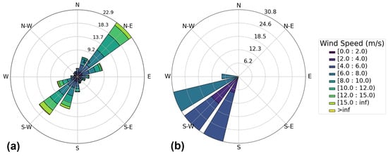 Wind rose diagram of accident location for the entire dataset: (a) 1 January 2023 to 31 December 2023; (b) 6 h before and after the accident time.