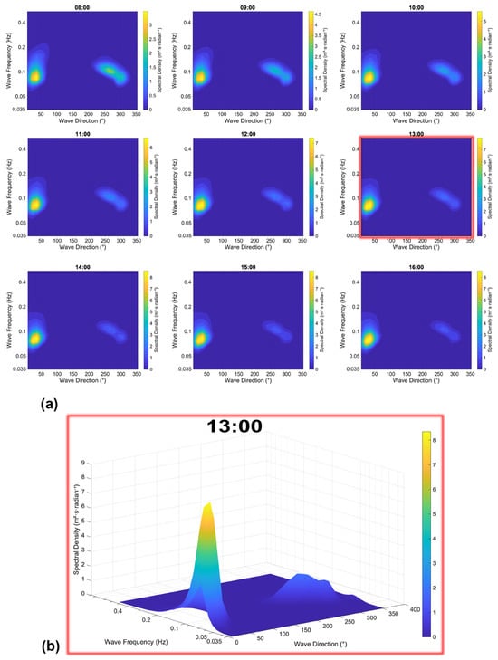 (a) Hourly evolution of 2D directional wave spectrum at the accident site from 08:00 to 16:00 UTC. (b) Wave spectrum at accident time outlined in red.