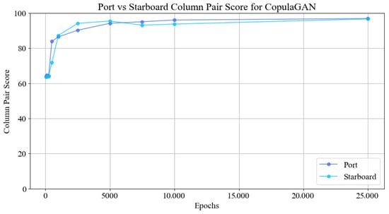 Figure 3 presents the evolution of the column pair score as a function of the number of training epochs for the CopulaGAN model. Two separate datasets, denoted port and starboard, were evaluated independently to assess the consistency and stability of the generative process across structurally similar yet statistically distinct inputs. The x-axis represents the training duration in epochs, ranging from 0 to 25,000, and the y-axis indicates the column pair score, scaled between 0 and 100, which represents the degree of preservation of pairwise statistical dependencies in the synthetic data relative to the original dataset.
