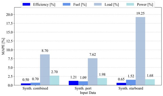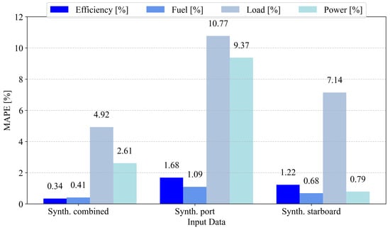Figure 5). Based on the standard acceptable errors in the field, the acceptable MAPE can be set to 2%. With this in mind, we can conclude that the port side’s engine efficiency can be targeted using any input data, which also applies to fuel consumption. The port’s engine power can be targeted using any inputs except combined synthetic data. In contrast, the load of the port-side engine cannot be targeted using any inputs, as all models achieve an error that is much higher than acceptable. For the starboard side, again, efficiency and fuel consumption are acceptable across all inputs; however, this is not the case for load and power. The load models have failed to converge to an acceptable solution, similar to the case of the port side engine. However, the only acceptable input for power was the synthetic data generated from the starboard engine’s data, resulting in a MAPE of 0.79%.