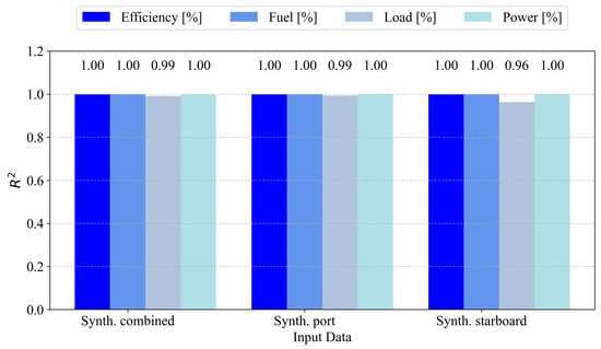 values for the models trained on the synthetic data derived from the port engine. All performance indicators—efficiency, fuel, load, and power—achieve near-perfect predictive accuracy. Both efficiency and fuel reach an