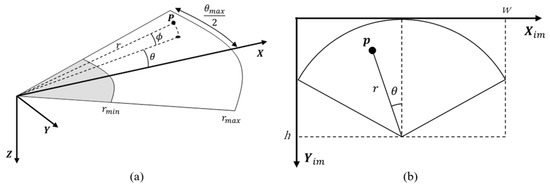 FLS imaging geometry. (a) 3D fan-shaped scanning model. (b) 2D image projection.