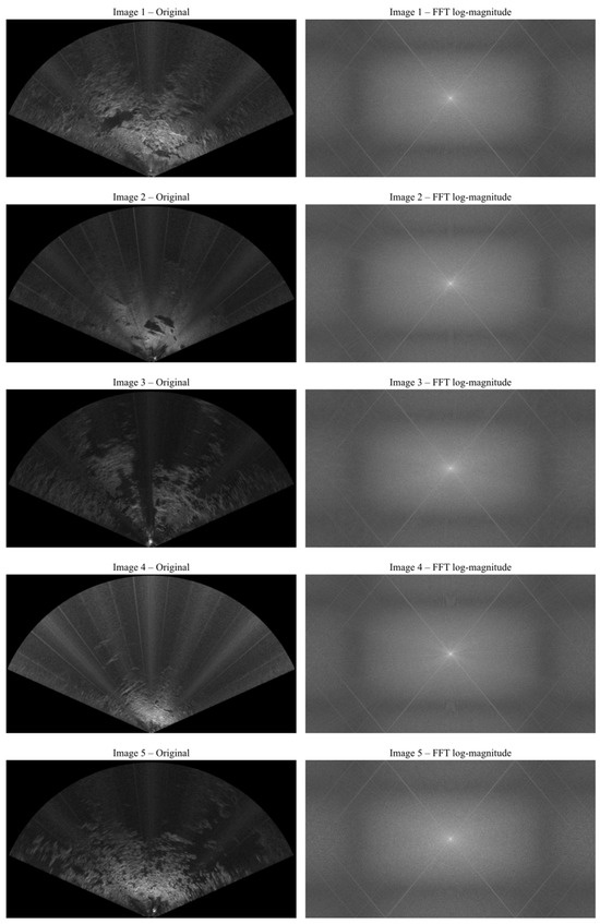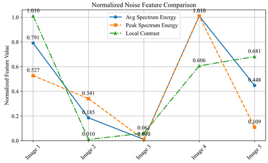 To validate the reasonableness of this noise modeling assumption, multiple FLS images collected under various deep-sea conditions were subjected to frequency-domain analysis, as shown in Figure 4 and Figure 5. Figure 4 reveals prominent stripe-like interference patterns, corresponding to high-intensity frequency components along specific directions in the Fourier spectrum, forming typical directional spectral peaks. Furthermore, Figure 5 presents the normalized noise characteristic curves extracted from the analyzed images. Despite differences in acquisition environments and scenes, the images exhibit similar distribution trends in metrics such as average spectral energy, peak spectral energy, and local contrast. This observation further demonstrates the common structural properties of sonar-image noise, particularly the dominance of multiplicative structures and directional stripe interference. These findings provide strong theoretical and practical support for the adoption of a denoising strategy that integrates frequency-domain suppression with structural modeling in the proposed algorithm.