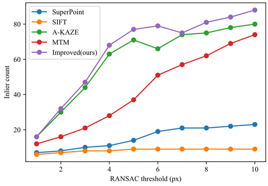 To further analyze the robustness of the algorithms under different RANSAC thresholds, the number of inliers was recorded as a function of the threshold, as shown in Figure 8. This metric reflects the stability of the matching performance under varying tolerance levels. The results indicate that traditional algorithms such as SIFT and A-KAZE are sensitive to noise under low threshold conditions, resulting in sparse matches. Although their inlier counts increase with higher thresholds, they tend to saturate. SuperPoint maintains a certain number of matches under high thresholds but suffers from insufficient accuracy. In contrast, the proposed method consistently maintains the highest inlier growth curve across the entire threshold range, demonstrating superior error tolerance and stability. This performance is particularly advantageous under challenging deep-sea imaging conditions characterized by strong speckle noise and weak feature responses.