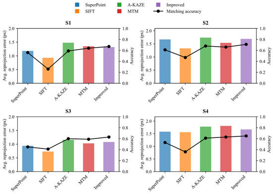 Furthermore, Figure 9 presents a comparison of the average reprojection error and matching accuracy across four typical scene pairs for each algorithm. The results show that the proposed method consistently achieves lower reprojection errors across multiple scenarios, while maintaining a matching accuracy exceeding 70%, outperforming traditional feature-based and template-matching methods. In particular, in challenging scenes such as S2 and S3, which exhibit significant local repetitive structures or shadow interference, the proposed method maintains good precision and consistency. These outcomes highlight the effectiveness of the uncertainty modeling incorporated into the algorithm. This is because the proposed matching strategy effectively handles repetitive textures and shadow-induced ambiguities through uncertainty-aware refinement and geometric consistency filtering. It is also worth noting that the performance on S3 is slightly lower than in other scenarios, which aligns with its nature as a feature-sparse flat sediment terrain. This reflects the inherent difficulty of such environments and highlights the potential for further enhancing adaptability in future work.