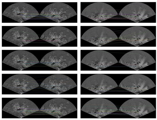 To further compare the matching quality from a visual perspective, Figure 10 presents the visualization of matching lines generated by various methods under different seafloor terrains. It can be observed that traditional methods suffer from dense mismatches and missing matches in texture-sparse regions. In contrast, the proposed method produces more uniform and concentrated matching lines, with key-points accurately aligned along structural edges or salient regions, demonstrating good adaptability across complex backgrounds such as rocks, gullies, and sediments.