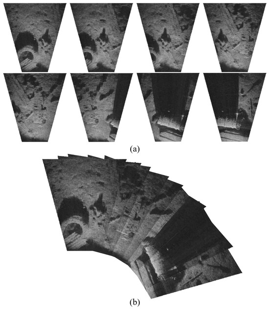 Stitching results of the ARIS Explorer 3000 Barrel Roll water-tank experiment: (a) raw fan-shaped frames; (b) stitched sonar panorama. Each frame covers a horizontal field of view of ~130°, with an effective range of approximately 3–5 m.