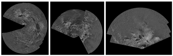 The water-tank dataset poses typical challenges such as prominent acoustic shadows, blurring, and echo interference. Figure 11a,b show examples of raw frames and the corresponding mosaicking results, respectively. As observed, even in the noisiest regions, the stitching boundaries are naturally aligned, and local details are well preserved. No noticeable misalignments or discontinuities are found in texture-sparse areas, indicating that the proposed fusion and mosaicking strategy effectively suppresses brightness non-uniformity and striping noise, maintaining a smooth and coherent panoramic image. Subsequently, the same mosaicking process was applied to multiple real-world FLS sequences collected from the deep-sea mining area. It is noteworthy that due to constraints such as tether drag and water currents, the DSMV typically scans slowly with minimal amplitude, resulting in a concentric fan-like overlay structure in most mosaicking results. Figure 12 illustrates several typical mosaicking examples. It can be observed that the outermost pixels of the initial frame, representing the first detection, are strictly preserved, and the seafloor terrain features are largely matched correctly with continuous and complete details. These results demonstrate the framework’s excellent noise suppression and seamless fusion capabilities, consistent with the outcomes observed in the water-tank experiments.