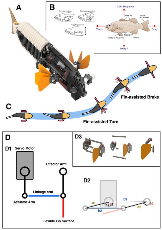 - Chen, L.; Bi, S.; Cai, Y.; Cao, Y.; Pan, G. Design and experimental research on a bionic robot fish with tri-dimensional soft pectoral fins inspired by cownose ray. J. Mar. Sci. Eng. 2022, 10, 537. [Google Scholar] [CrossRef]