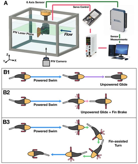 - Force measurement: An ATI (NC, USA) Gamma US-15-50 six-axis force/torque sensor connected to the fin mechanism via a custom 3D-printed adapter.