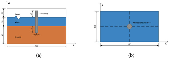 Schematic diagram of monopile foundation and geometric model of seabed foundation (unit: m): (a) front view; (b) vertical view.