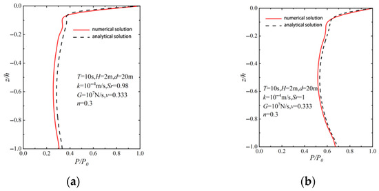 Comparison of the numerical results of the pore pressure amplitude in the depth direction of the coastal bed of fine sand with the results of the analytical solution: (a) Sr = 0.98; (b) Sr = 1.