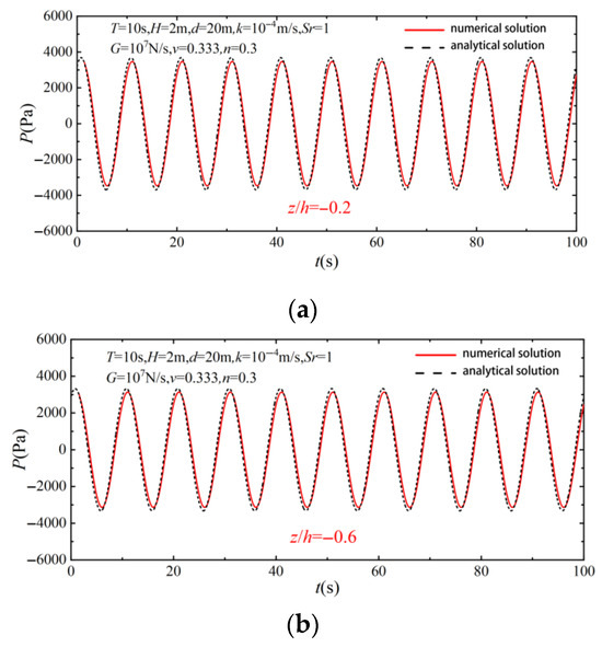 Numerical results of pore pressure ephemeral curves for different seabed depths in fine sand compared with analytical solution: (a) z/h = −0.2; (b) z/h = −0.6.