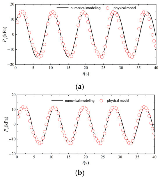 Comparison of experimental results and numerical simulation results of pore water pressure duration curves at different seabed depths: (a) depth corresponding to pore water manometer P1; (b) depth corresponding to pore water manometer P3.