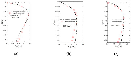 Current studies on the response of the seabed around piles under pile vibration are limited, so verifying the accuracy of the pile vibration model is crucial for further studies. In this study, the influence of pile vibration on the soil around the pile under lateral cyclic loading was studied by comparing the physical model test results of [36]. Hansen’s test used three sets of pore pressure sensors to measure the pore water pressure at 2 cm, 7 cm, and 12 cm from the water–soil interface. The test included coarse sand and fine sand. In this study, the coarse sand test data were selected for comparison, and the model parameters were consistent with the test settings. Figure 5 shows the vertical pore pressure distributions of the numerical simulation results (black dashed lines) and the test data (red squares) at R = 2 cm, 7 cm, and 12 cm from the seabed mudline, and the results show that the two changes have the same trend and the fit is good. Despite the differences in research methods and boundary conditions, this study’s model can accurately reflect the effect of pile vibration on soil response. This verifies the model’s applicability and reliability.
