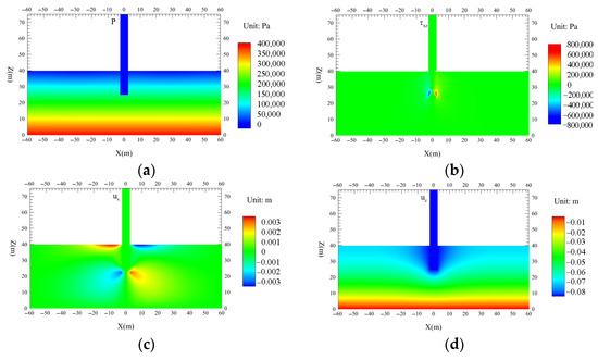 Pore pressure, shear stress, and displacement distribution in monopile foundations for offshore wind turbines and their seabed soils: (a) pore pressure; (b) shear stress; (c) x-direction displacement; (d) z-direction displacement.