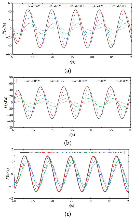 Figure 7 shows the time curves of the pore pressure oscillation response at different depths of the seabed under different parameters (z/h = −0.0625~−0.3125). Figure 7a shows the time domain curves of the pore pressure oscillation response at different depths of the seabed under the joint action of wave–vibration, from which it can be seen that there are significant differences in the peak value of the pore pressure and the phase of the waveforms at different depths. This indicates that the differences in pile displacements caused by wave and vibration action will result in significantly different pore pressure dissipation characteristics at different points of the seabed soil at vertical locations. Figure 7b,c show the pore pressure vibration response curves at different depths of the seabed under vibration and wave action, respectively. Comparison with and analysis of Figure 7a show that the pore pressure peaks and wave phases at different depths along the seabed show significant differences, whether due to wave action, vibration, or the combined action of both. Within a complete loading cycle, the differences in wave pressure or pile displacement result in significant differences in pore pressure dissipation characteristics at different vertical locations along the seabed soil body. Specifically, under wave action, the pore pressure dissipation characteristics vary significantly with depth; under vibration action, the differences in pile displacement lead to different dissipation patterns in the pore pressure response; and under joint wave–vibration action, the pore pressure dissipation characteristics are similar to those under wave or vibration action alone, further verifying the mechanism of the joint influence of wave–vibration on the pore pressure response of seabed soils.