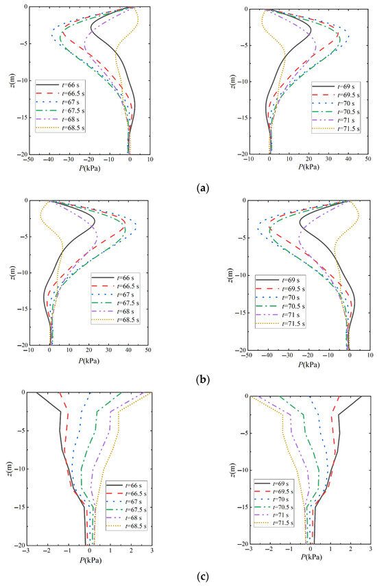 Figure 8 shows the distribution characteristics of the vertical pore pressure in front of the pile at different moments in one cycle under the action of different parameters (t = 66 s~71.5 s). Among them, Figure 8a–c represent the distribution characteristics of the vertical pore pressure in front of the pile at different moments in one cycle under the action of wave–vibration, vibration, and wave, respectively. It can be seen from Figure 8a that the pore pressure response along the depth direction of the seabed exhibits a basically symmetrical distribution pattern during a complete cycle under the joint action of wave and vibration, and this pattern is consistent with the situation under the action of wave alone and vibration alone, as can be seen from the combination of Figure 8b,c. In addition, similar to the distribution of vertical pore pressure in front of the pile at different moments under vibration, the pore pressure along the depth direction of the seabed soil body shows a tendency to increase and then decrease, and the pore pressure amplitude point along the depth direction of the seabed gradually moves to a deeper depth of the seabed at each moment with the passage of time. However, unlike vibration alone, the pore pressure at the seabed surface is equal to the wave pressure under the combined action of waves and vibrations, while the pore pressure at the seabed surface is zero under vibrations alone.