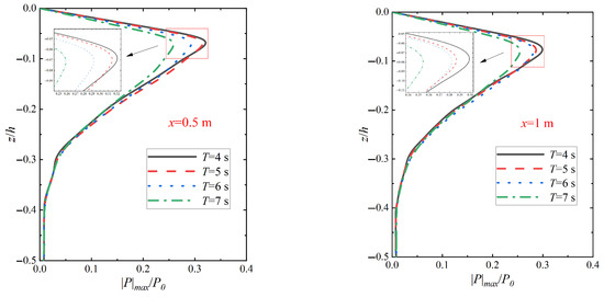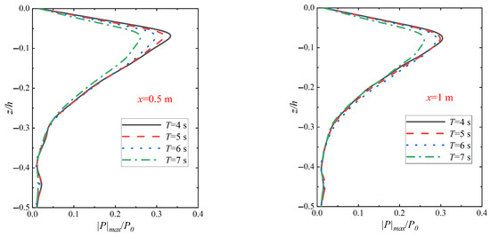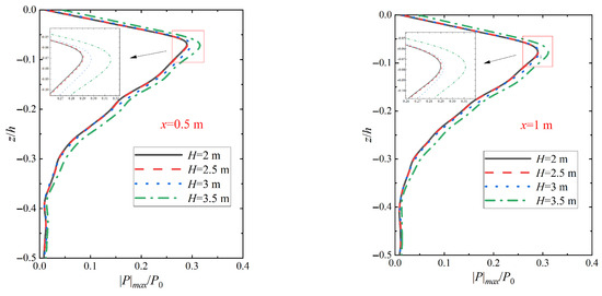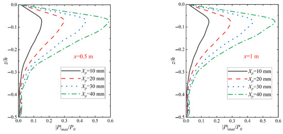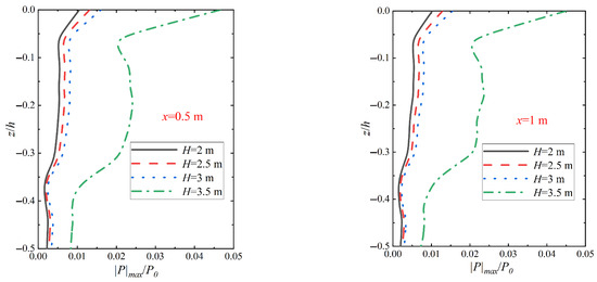 Figure 9 shows the variation in the vertical pore pressure amplitude distribution on the seabed at different locations in relation to the pile wall for different wave heights of H action under the wave–vibration joint action. Compared with the pure vibration action, the wave incidence brings more energy, resulting in a larger wave pressure on the seabed surface, and the pore pressure amplitude increases with the increase in wave height. The pore pressure amplitude decays rapidly near the surface, but the decay rate slows down and tends to equilibrate with increasing depth. Comparison with Figure 10 shows that under wave action, the pore pressure amplitude in the middle and upper regions of the seabed (z/h > −0.30) is basically the same as that of wave action alone, and the relative amplitude of pore pressure at various depths increases with the increase in wave action, and the pore pressure gradient also increases accordingly. Comparing the relative amplitude of pore pressure |p|max/p0 at different wave heights (H = 2 m, 2.5 m, 3 m, 3.5 m), it is found that the relative amplitude of pore pressure|p|max/p0 under wave–vibration at the relative depth of z/h = −0.06 is increased by tens of times as compared with that under wave action, respectively. This indicates that the effect of vibration on the pore pressure amplitude distribution decreases with increasing wave height, especially in the shallow region. However, in the deeper region (z/h < −0.40), the periodic horizontal displacement of the pile body enhances the penetration of the water wave pressure to the bottom, which further enlarges the significant region of the pore water pressure gradient change, leading to a significant change in the pore pressure amplitude decay characteristics compared to the wave action alone. The x in the figure indicates the distance from the pile wall, and this representation remains consistent in subsequent images.