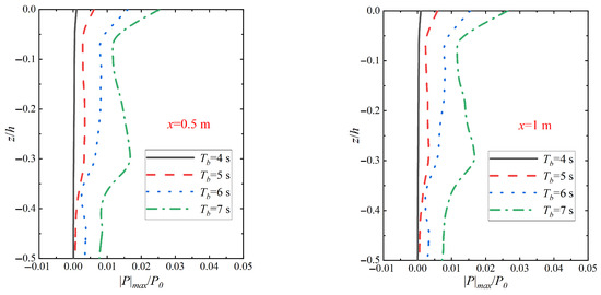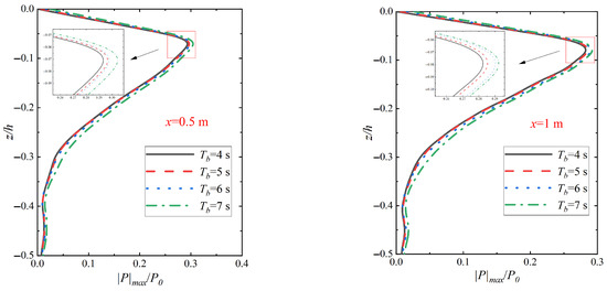 Figure 11 shows the variation in the amplitude distribution of vertical pore pressure on the seabed at different locations from the pile wall under wave–vibration action with different wave period Tb actions. From the figure, it can be seen that the amplitude of pore pressure at all depths of the seabed shows an increasing trend with the increase in wave period. Comparison with the relative amplitude of pore pressure |p|max/p0 at different wave periods (Tb = 4 s, 5 s, 6 s, 7 s) in Figure 12 reveals that the relative amplitude of pore pressure |p|max/p0 under the joint wave–vibration action at the relative depth z/h = −0.06 is increased by tens of times compared with that under the wave action alone. This indicates that the effect of vibration on the pore pressure amplitude distribution decreases with increasing wave period in the shallow seabed region. In addition, although the increase in wave period leads to an increase in pore pressure amplitude at all depths of the seabed, the increase is not significant. This phenomenon may be related to the nonlinear response characteristics of the seabed soil, which may increase significantly with increasing wave periods, but saturates after reaching a certain threshold. Therefore, although the increase in wave period may exacerbate the nonlinear response of the soil to a certain extent, the enhancement effect of this response slows down after a certain period, resulting in a levelling off of the increase in pore pressure amplitude. This pattern further reveals the complex relationship between wave period and the dynamic response of the seabed soil.