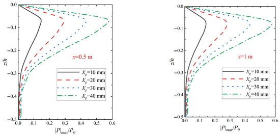 Variation in seabed vertical pore pressure amplitude distribution under vibration with different peak vibration displacement Xp actions (T = 6 s, k = 1 × 10−4 m/s, Sr = 1.0).