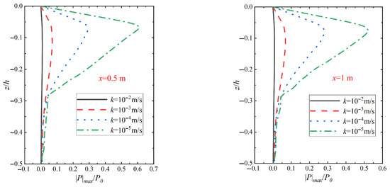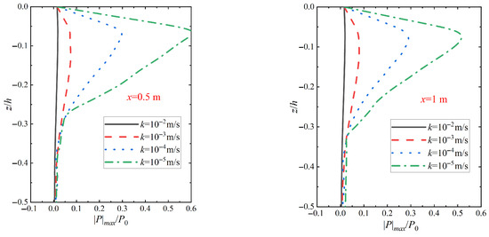 Figure 17 shows the changes in the distribution of pore pressure amplitude in the vertical direction of the seabed at different positions in relation to the pile wall under wave–vibration action with different seabed permeability coefficients k. From the figure, it can be seen that the relative amplitude of pore pressure along the seabed in the direction of relative depth gradually decreases with the increase in the seabed permeability coefficient. This is because the high permeability coefficient of the seabed can cause the infiltration effect within the soil, i.e., the infiltration of the water flow through the soil particles, and this infiltration effect helps to disperse the wave energy and vibration effects and reduce the interaction between the wave and vibration effects and the soil, which leads to a decrease in the amplitude of pore pressure along the depth direction of the seabed with the increase in the permeability coefficient. Comparison with Figure 18 shows that the relative amplitude of pore pressure at different seabed permeability coefficients (k = 10−2 m/s, 10−3 m/s, 10−4 m/s, 10−5 m/s) is found to vary with the relative depth of wave–vibration at z/h = −0.06, as shown in Figure 18, which shows that the relative amplitude of pore pressure at different depths (k = 10−2 m/s, 10−3 m/s, 10−4 m/s, 10−5 m/s) is found to decrease with increasing depth. The relative amplitude |p|max/p0 is found to be significantly lower for wave–vibration action at relative depth z/h = −0.06 compared to vibration alone. From the attenuation rate it can be concluded that the wave action prevents the interaction between the vibration action and the soil, which reduces the maximum value of the relative magnitude of the pore pressure |p|max/p0 under wave–vibration action.