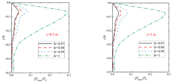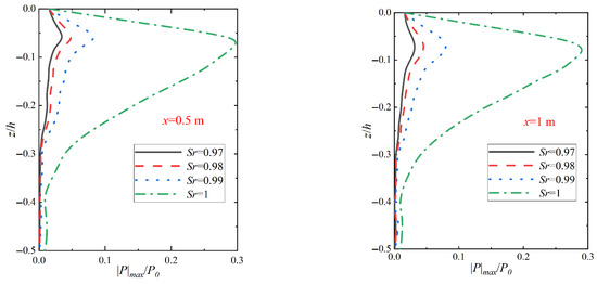 Variation in seabed vertical pore pressure amplitude distribution under vibration with different seabed saturation Sr actions (Xp = 20 mm, T = 6 s, k = 1 × 10−4 m/s).