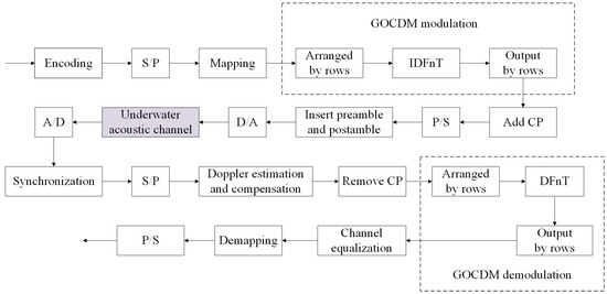 The above equation utilizes the property that the inverse of the Kronecker product of two matrices equals the Kronecker product of their respective inverses. From this equation, it is evident that is also a unitary matrix, with its inverse given by , which corresponds to the modulation matrix . In this paper, GOCDM is applied to the underwater acoustic communication system, and the flowchart is shown in Figure 2.