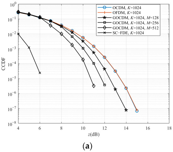 We analyze the PAPR performance of different modulation schemes using the Complementary Cumulative Distribution Function (CCDF), which represents the probability that the root mean square of the signal’s PAPR exceeds a given threshold z. As shown in Figure 3, the PAPR of GOCDM is consistently lower than that of conventional OFDM and OCDM. In Figure 3a, it is evident that conventional OFDM and OCDM exhibit the same PAPR characteristics. However, the proposed GOCDM method significantly reduces the PAPR compared to these conventional schemes. Specifically, for cases where the PAPR exceeds 12 dB, increasing the M leads to a reduction in the probability of high PAPR occurrences in GOCDM modulation by 1 to 3 orders of magnitude compared to OFDM and OCDM.