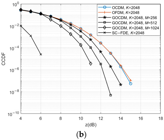 The CCDF of OFDM, OCDM, SC-FDE, and GOCDM: (a) K = 1024, and (b) K = 2048.