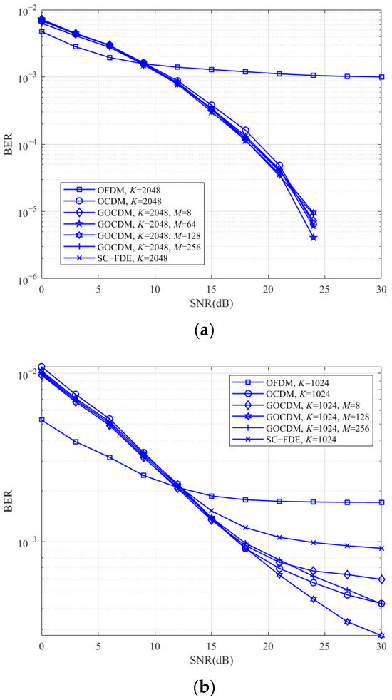 The BER of OFDM, OCDM, SC-FDE, and GOCDM: (a) K = 2048, and (b) K = 1024.