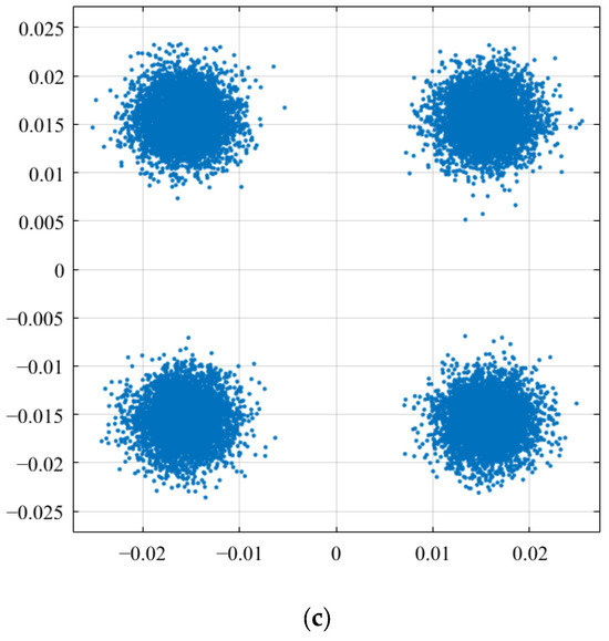 Additionally, in Figure 5b, the BER curves of OCDM and GOCDM do not coincide. When the cyclic prefix is insufficient, the leading portion of each data block is affected. As N decreases, the proportion of original data impacted by GOCDM-modulated data decreases; however, the severity of the impact increases. Particularly when M equals K, GOCDM degenerates into SC-FDE, where the initial few information bits of each data block suffer severe interference. At lower signal-to-noise ratios, the SNR constitutes the dominant factor affecting bit error rates, rendering the impact of different M values on BER negligible. Conversely, at higher SNR levels, inter-symbol interference dominates as the primary error contributor. As a single-carrier modulation scheme, SC-FDE experiences the most severe inter-symbol interference, consequently exhibiting a higher BER. Therefore, selecting an appropriate N based on the specific multipath delay characteristics is crucial. The constellation diagrams for K = 2048 and an SNR of 25 dB are shown in Figure 6. From these diagrams, it is evident that both OCDM and GOCDM offer superior resistance to multipath interference compared to OFDM.
