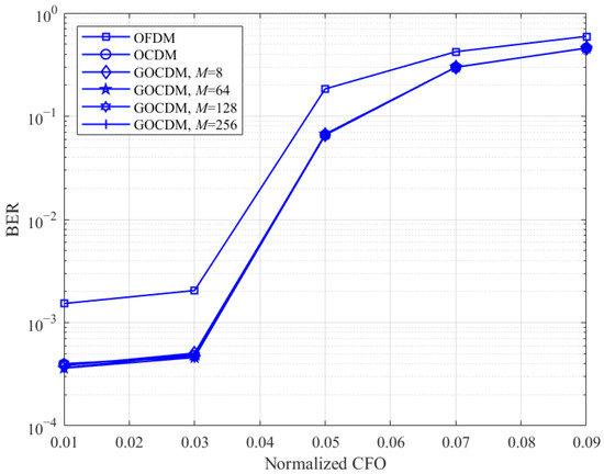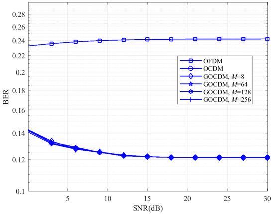 The results are presented in Figure 5. From Figure 5a, it can be observed that GOCDM exhibits performance similar to OCDM. This is because GOCDM inherits the advantages of conventional OCDM, where subcarriers achieve full frequency diversity, as theoretically analyzed in Section 3. In Figure 5b, when the cyclic prefix is insufficient, both GOCDM and OCDM experience significant performance degradation, while OFDM shows less degradation. This is because, compared to OCDM, OFDM demonstrates better robustness in frequency-selective fading conditions with poor channel estimation.