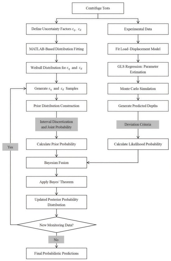 This study utilizes data from 40 centrifuge tests to predict the peak resistance and its corresponding depth using two empirical formulas. To quantify prediction uncertainties, uncertainty factors and are defined. MATLAB (R2022a)—based fitting revealed that these factors follow Weibull distributions, which then served to quantify model uncertainty. A Bayesian predictive model was subsequently developed. First, leveraging the fitted Weibull distributions, a large number of and samples were generated. Prior probability distributions were constructed using interval discretization and joint probability calculations. Second, the load–displacement model was fitted to the experimental data, incorporating a dimensionless parameter representing soil properties. The parameters of were determined using Generalized Least Squares (GLS) regression. Given the model bias coefficient’s normal distribution characteristics, a Monte Carlo simulation was used to generate predicted depths . Likelihood probabilities were calculated based on defined deviation criteria. Finally, applying Bayes’ theorem, the prior probabilities and likelihood probabilities were fused to obtain the updated posterior probability distribution. This model enables continuous iterative updating as new monitoring data becomes available. The analytical process of the probabilistic prediction model is shown in Figure 1.