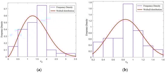 where x is the random variable ( and in this case), a is the scale parameter, and b is the shape parameter. For both the ISO-recommended method and Zheng method, the best values of and b are fitted and listed in Table 2.