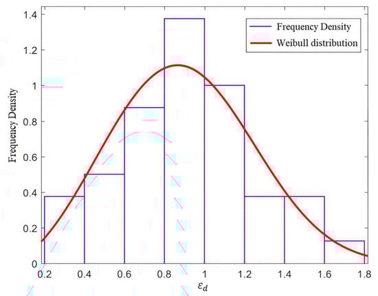 To describe the randomness of the parameter , a deviation coefficient is introduced, as in Equation (11). Based on the fitting result, the deviation coefficient obeys a normal distribution with a mean of 0 and variance of 2.65.